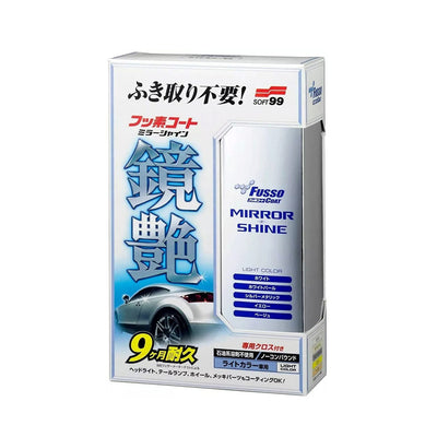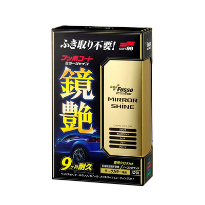 By just applying the wax with included microfiber cloth, Mirror Shine WAX will create a mirror-like clear gloss and shine. This solid wax creates a thick-film coating without the need to wipe or dry, and it lasts for up to 3 months. May be used on plastic parts as well, such as headlight covers, car visor and tail lamps.