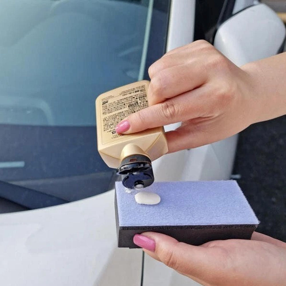 Newly formulated triple-abrasive particles easily removes scaly spots which conventional compound cleaners cannot. Removes fluorine and sticky oil-film deposits. Restores car's glass close to original transparency. Special application pad is included.