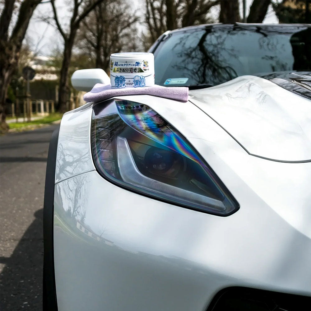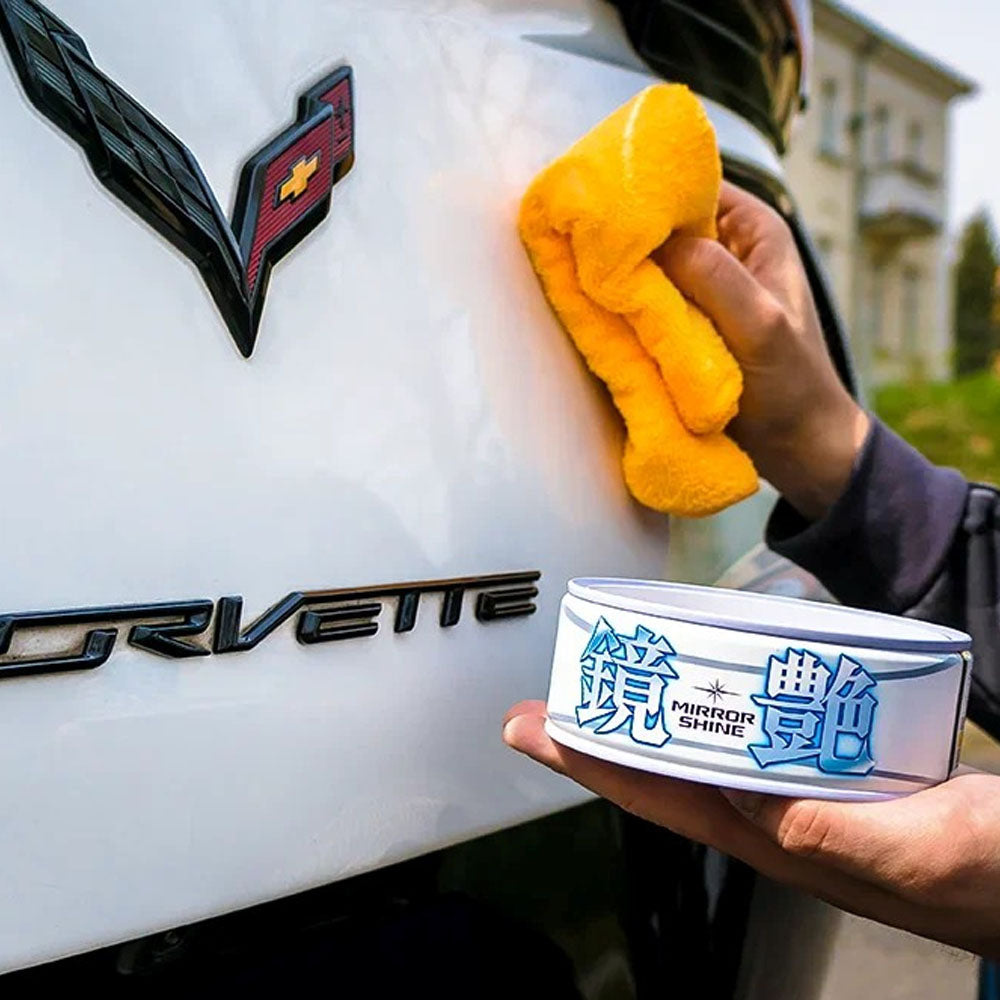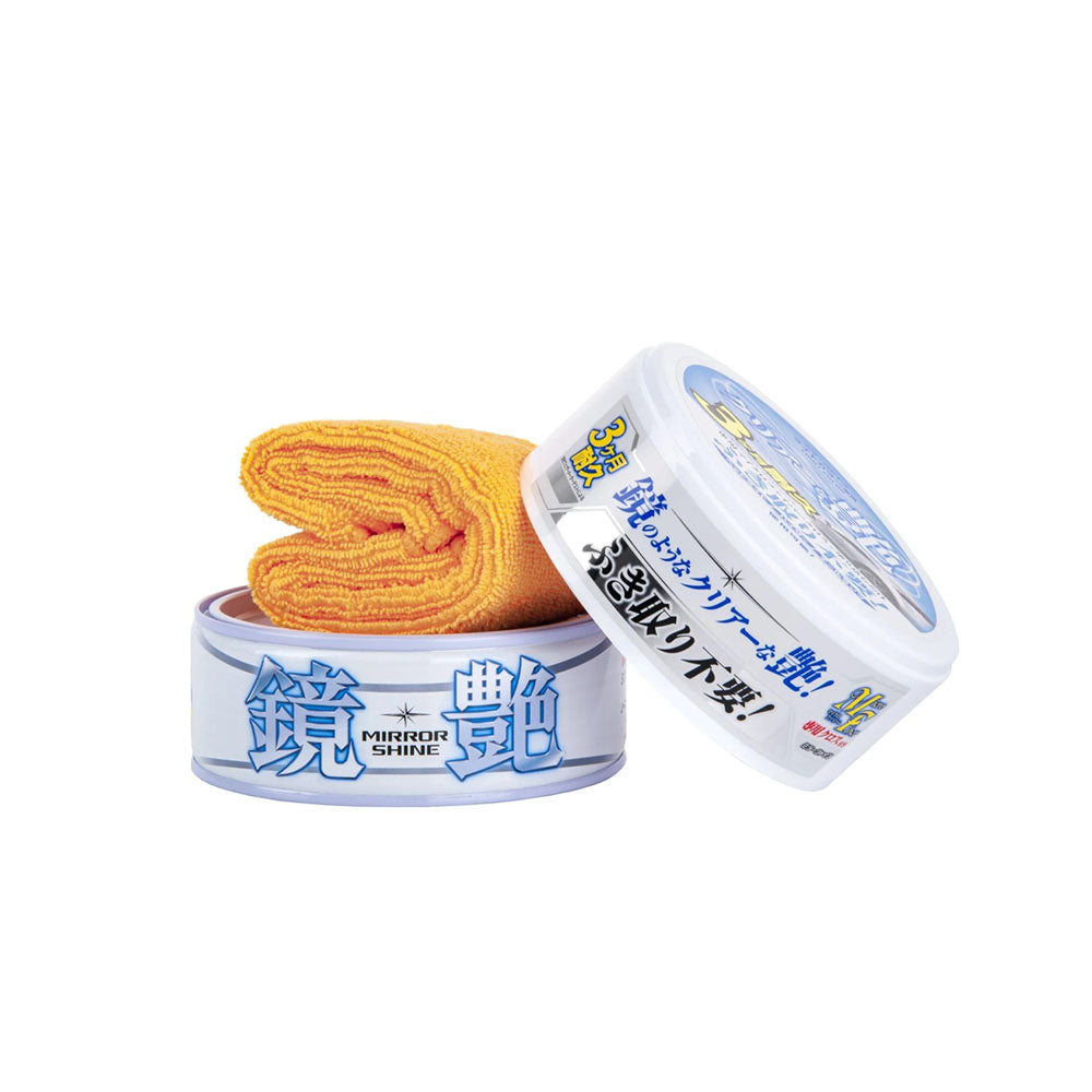 By just applying the wax with included microfiber cloth, Mirror Shine WAX will create a mirror-like clear gloss and shine. This solid wax creates a thick-film coating without the need to wipe or dry, and it lasts for up to 3 months. May be used on plastic parts as well, such as headlight covers, car visor and tail lamps.