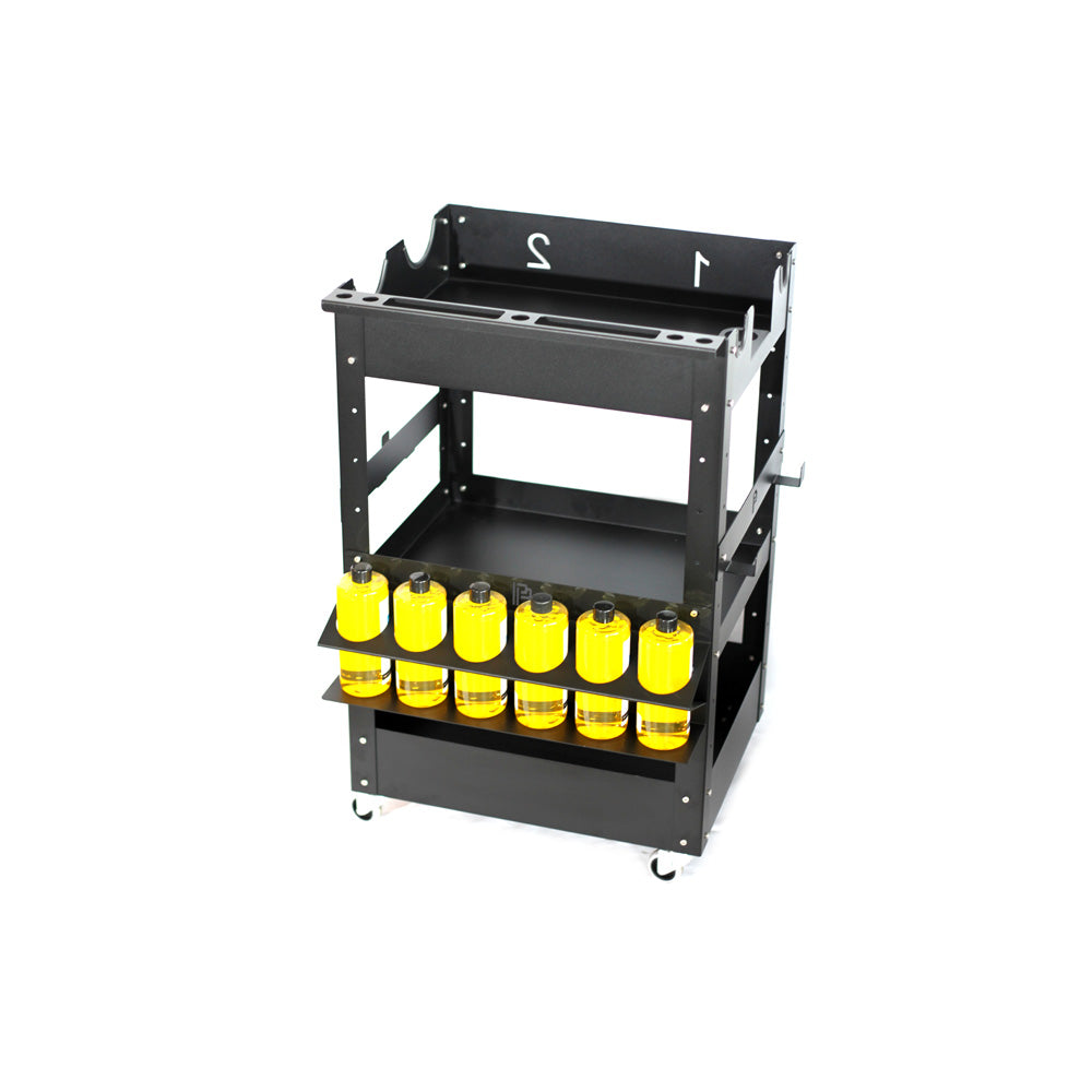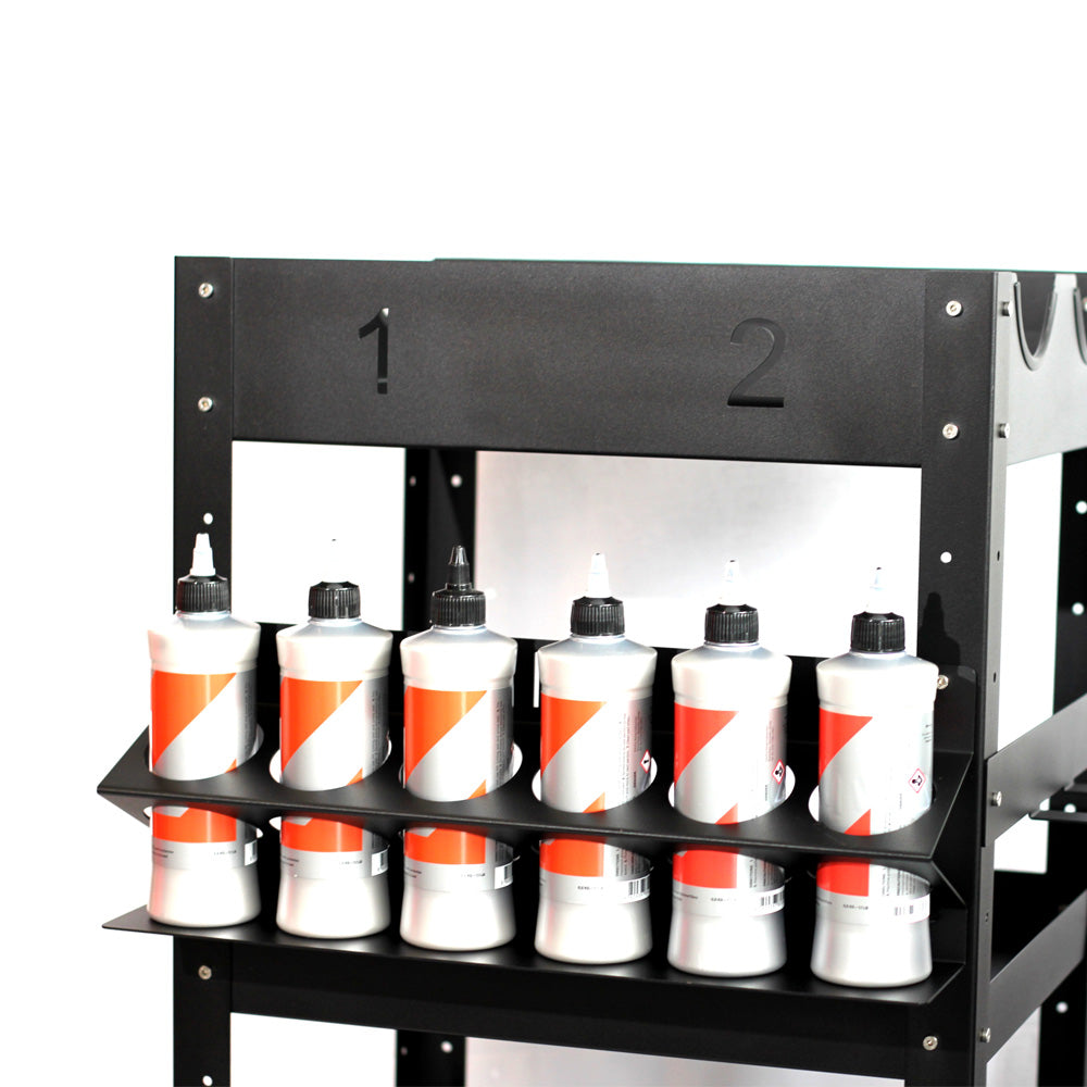 0.5L bottle holder to organise 6 of your favourites bottle or compounds. The design allows for storage of spray bottle without straining the trigger spray.