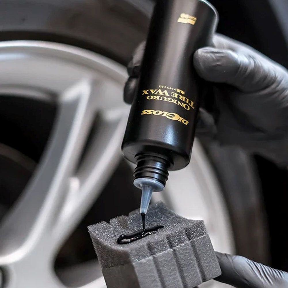 Note: To avoid slinging onto the body etc., do not drive until fully dry. Depending on the condition of the tyre, some unevenness may occur. In that event, allow to dry, and apply more liquid to create an even appearance. DiGloss Pitasupo Tire Sponge is also available for purchase separately. To increase gloss, polish gently with a cloth after drying.