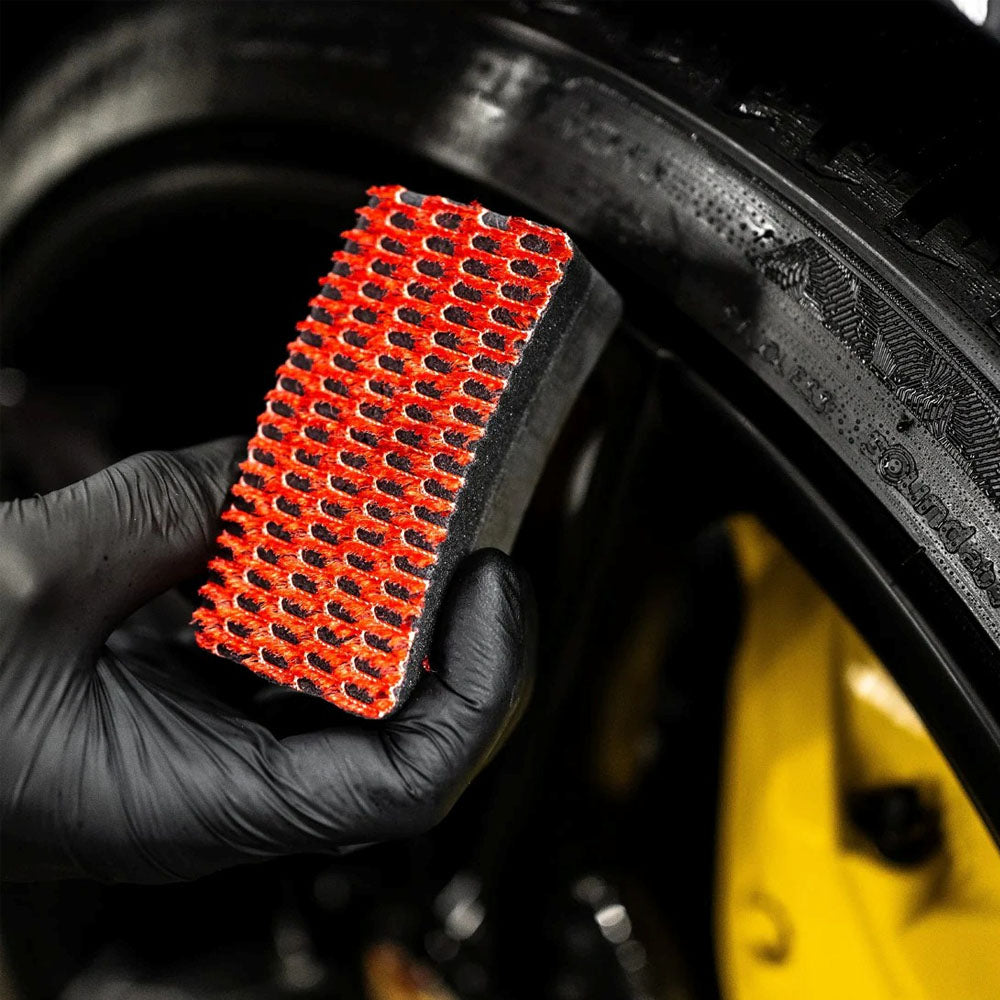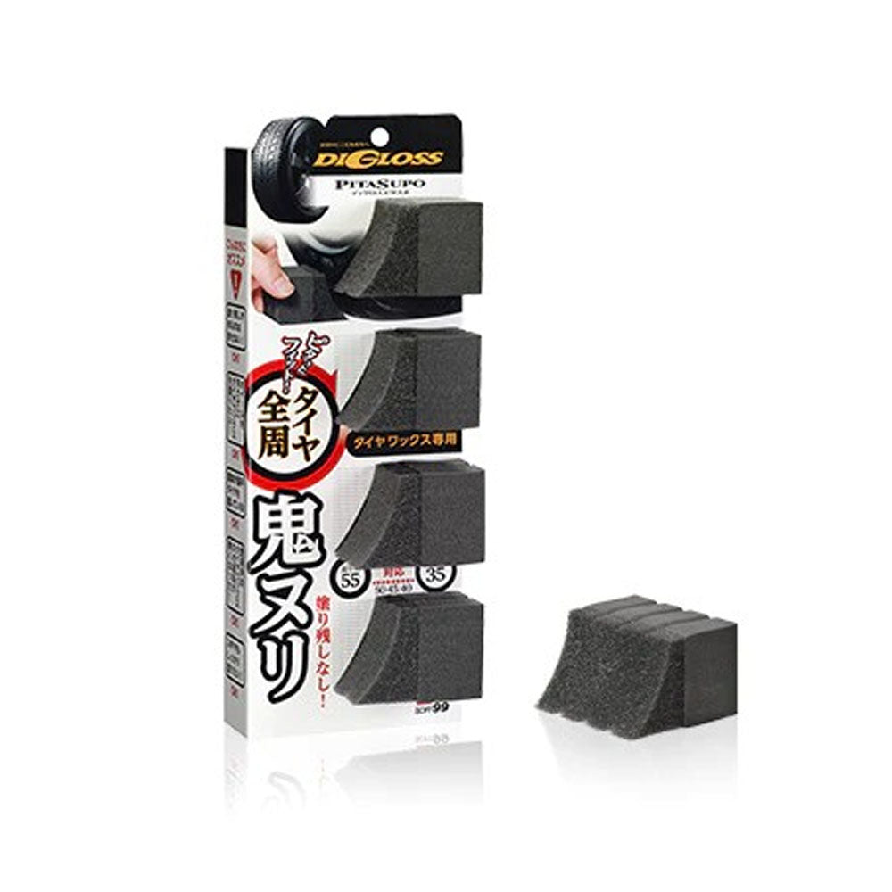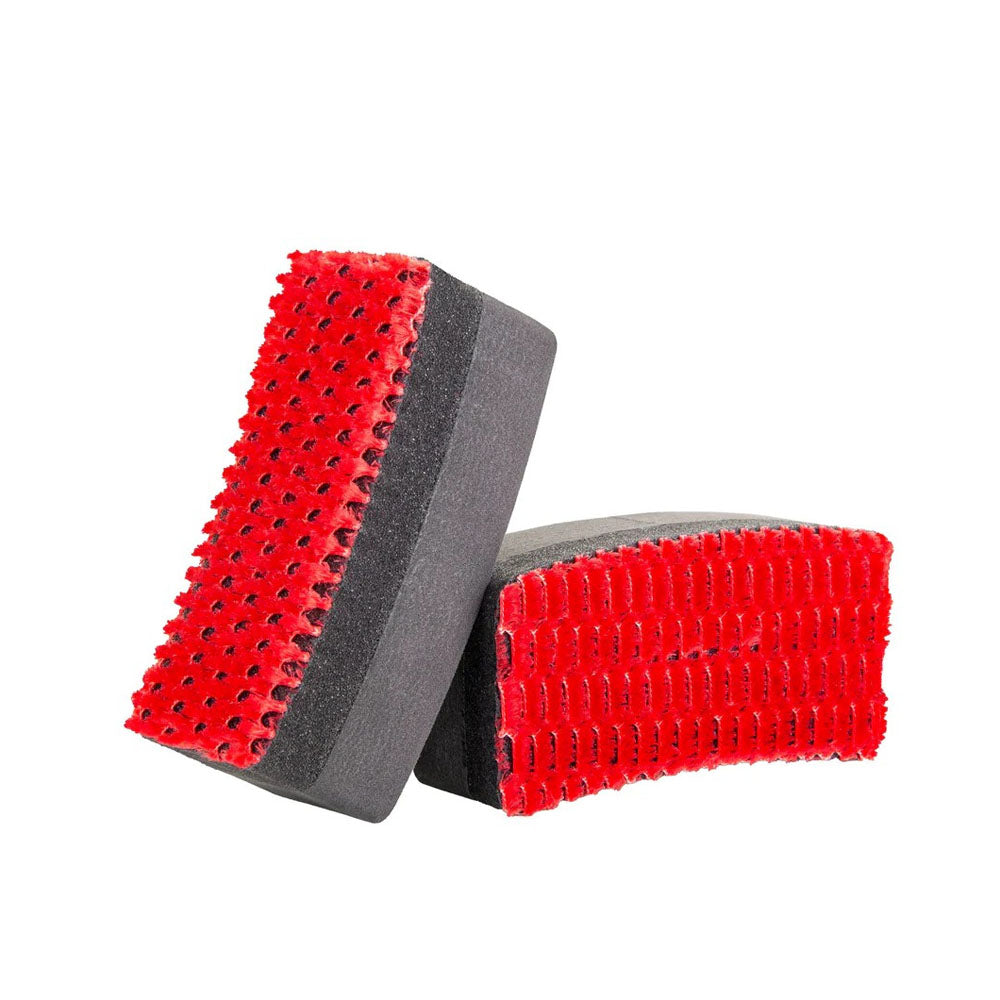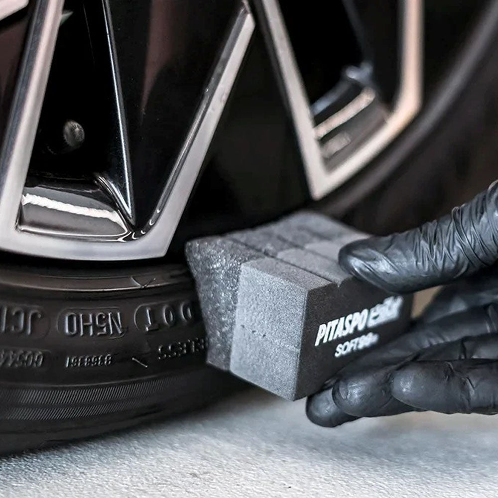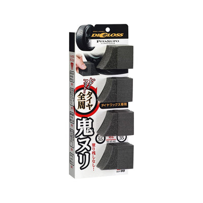 A specialised sponge for tyres, which removes the need to move the vehicle for a complete application. The fine edge allows application of tyre waxes etc. right up to the edge of the rubber, without getting the wheel dirty. The V-cut grip prevents slipping, and the urethane sponge structure ensures even application. Includes 4 pieces.